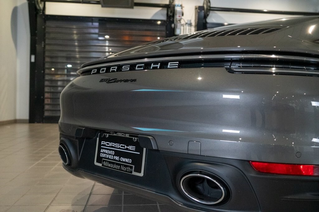 14-Way Power Sport Seats w/Memory Package, Premium Package (Ambient Lighting, BOSE Surround Sound System, Front Ventilated Seats, Lane Change Assist (LCA), Porsche Dynamic Light System Plus (PDLS+), Power Folding Exterior Mirrors, and Surround View), Sound Package Plus, Sport Chrono Package, Storage Package, Porsche Approved Certified Pre-Owned Certified, Brake assist, Electric Slide/Tilt Glass Sunroof, Extended Range 23.7 Gallon Fuel Tank, Heated front seats, Heated Steering Wheel, Power Steering Plus, Sport Exhaust System w/Tailpipes in Silver, Wheels: 20" Fr/21" Rr Carrera Exclusive Design, 4-Wheel Disc Brakes, 8 Speakers, ABS brakes, Adaptive suspension, Air Conditioning, Alloy wheels, Auto-dimming door mirrors, Auto-dimming Rear-View mirror, Automatic temperature control, Bumpers: body-color, Delay-off headlights, Driver door bin, Driver vanity mirror, Dual front impact airbags, Dual front side impact airbags, Electronic Stability Control, Exterior Parking Camera Rear, Four wheel independent suspension, Front anti-roll bar, Front Bucket Seats, Front Center Armrest, Front dual zone A/C, Front reading lights, Fully automatic headlights, Garage door transmitter: HomeLink, Heated door mirrors, Illuminated entry, Leather Seat Trim, Leather