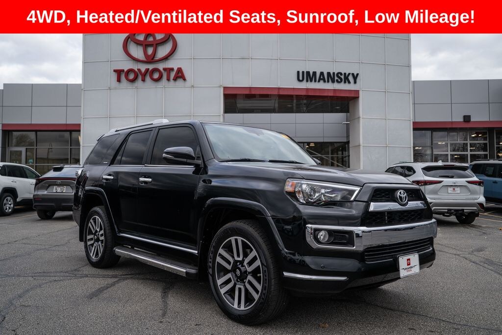 Toyota Silver Certified Pre-Owned 12 Month/ 12,000 Mile Warranty, Take on every journey with power and style in the 2017 Toyota 4Runner Limited, finished in bold Midnight Black Metallic and available now at Umansky Toyota in Milwaukee, Wisconsin. This rugged yet refined SUV combines Toyotaâs legendary durability with premium comfort and capability. The upscale Sand Beige interior offers luxurious leather-trimmed seating, advanced technology, and spacious versatility for family adventures or daily drives. Powered by a strong V6 engine and equipped with a capable 4WD system, the 4Runner Limited delivers confident performance on and off the road. Visit Umansky Toyota in Milwaukee today to test drive this impressive 2017 Toyota 4Runner Limited and experience the perfect blend of toughness and sophistication!, 4WD, Sand Beige w/Leather Seat Trim, 20" x 7.5" Unique Dual 6-Spoke Alloy Wheels, ABS brakes, Alloy wheels, Body Color Heated Mirrors, Compass, Electronic Stability Control, Front dual zone A/C, Heated door mirrors, Heated front seats, Heated/Ventilated Front Bucket Seats, Illuminated entry, Leather Seat Trim, Low tire pressure warning, Power moonroof, Remote keyless entry, Traction control. Odometer is 39731 miles below market average!
