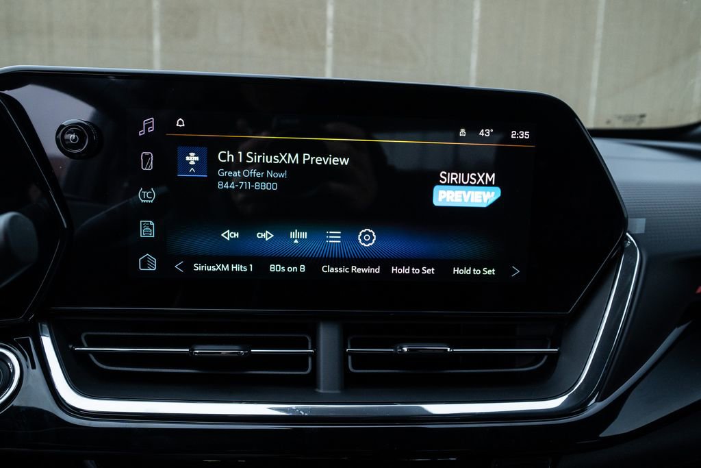 Trax 2RS, 2-Way Adjustable Front Head Restraints, 2-Way Power Driver Lumbar Seat Adjuster, 3.50 Final Drive Axle Ratio, 4-Way Manual Front Passenger Seat Adjuster, 4-Wheel Disc Brakes, 6 Speakers, 6-Speaker Audio System Feature, 8-Way Power Driver Seat Adjuster, ABS brakes, Air Conditioning, Alloy wheels, AM/FM radio: SiriusXM, Auto High-beam Headlights, Automatic temperature control, Brake assist, Bumpers: body-color, Compass, Delay-off headlights, Driver door bin, Driver vanity mirror, Dual front impact airbags, Dual front side impact airbags, Electronic Stability Control, Emergency communication system: OnStar One Essentials, Evotex Seat Trim, Exterior Parking Camera Rear, Front anti-roll bar, Front Bucket Seats, Front Center Armrest, Front reading lights, Front wheel independent suspension, Fully automatic headlights, Heated door mirrors, Heated Driver and Front Passenger Seats, Heated front seats, Heated steering wheel, Illuminated entry, Leather steering wheel, Low tire pressure warning, Occupant sensing airbag, Outside temperature display, Overhead airbag, Overhead console, Panic alarm, Passenger door bin, Passenger vanity mirror, Power door mirrors, Power driver seat, Power steering, Power windows, Premium audio system: Chevrolet Infotainment 3, Radio data system, Radio: AM/FM Stereo Audio System, Rear window defroster, Rear window wiper, Remote keyless entry, Security system, SiriusXM Trial Subscription, Speed control, Split folding rear seat, Spoiler, Sport steering wheel, Steering wheel mounted audio controls, Tachometer, Telescoping steering wheel, Tilt steering wheel, Traction control, Trip computer, Variably intermittent wipers, Wheels: 19 Black-Painted Machined Aluminum, and Wireless Apple CarPlay/Wireless Android Auto.