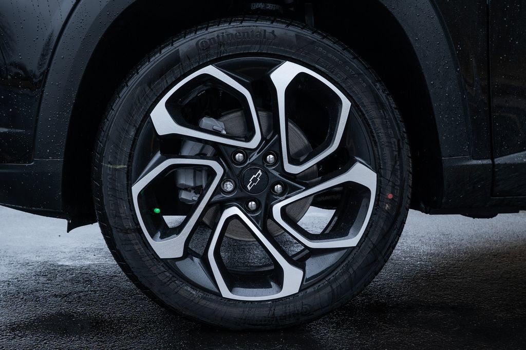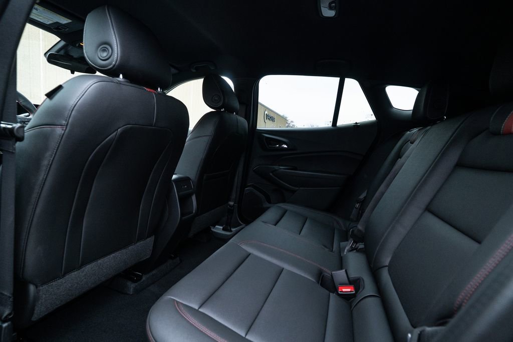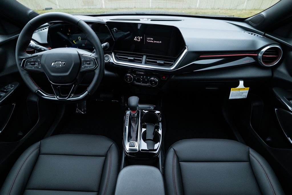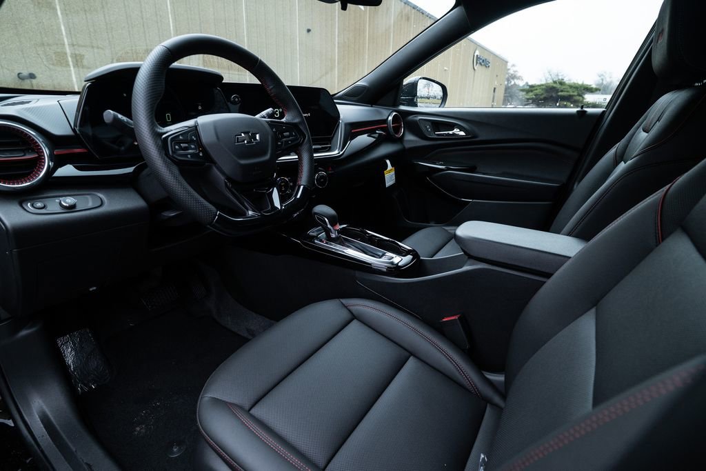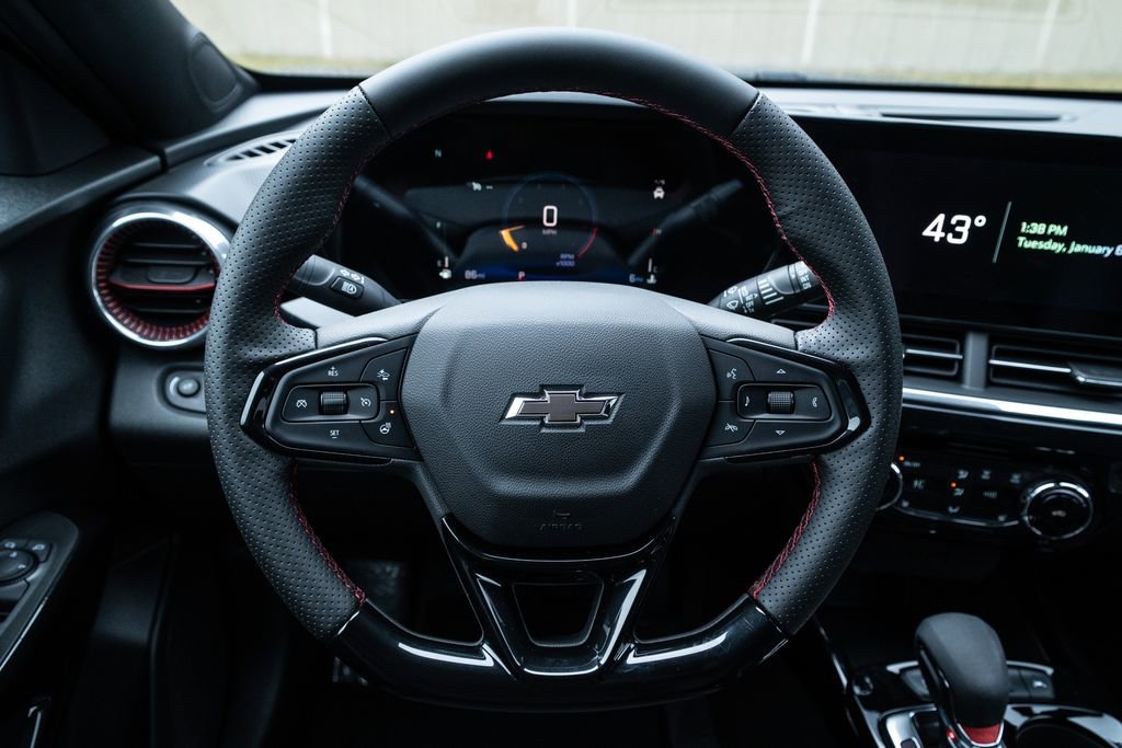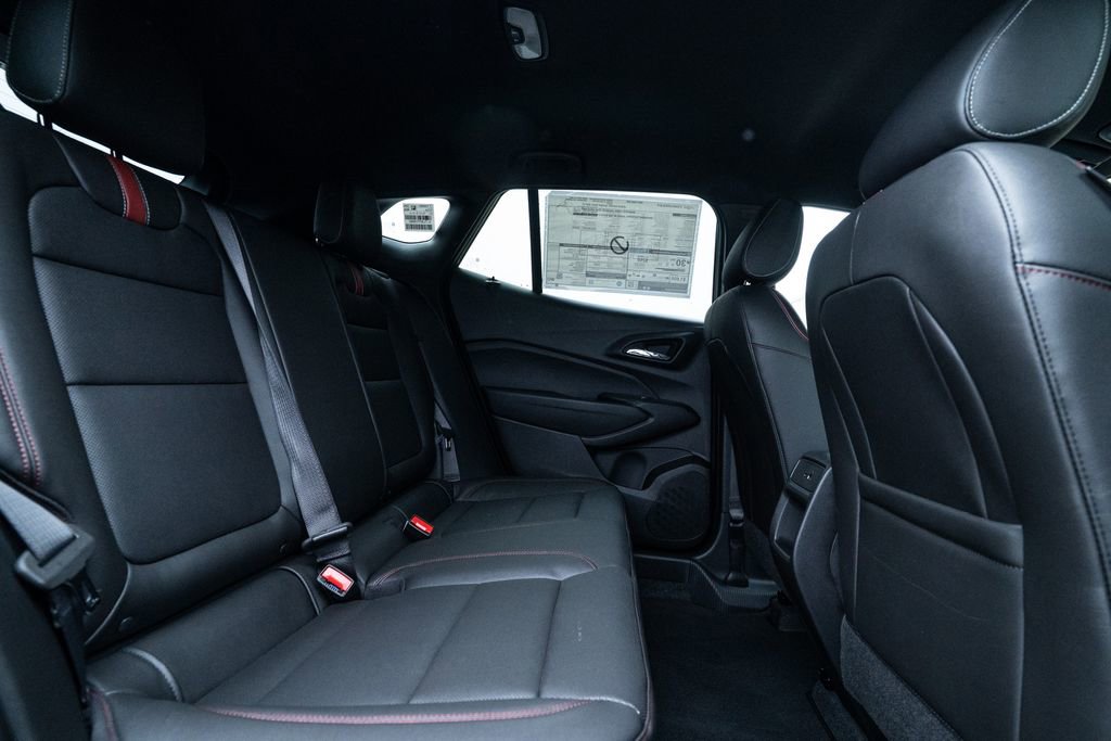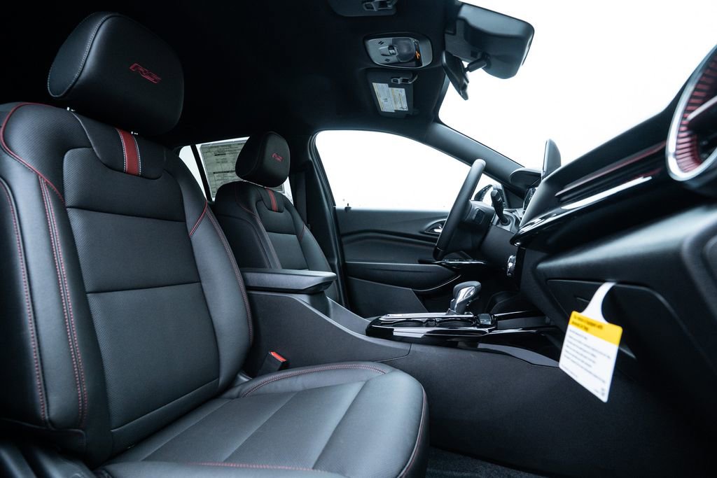 License Plate Front Mounting Package, Preferred Equipment Group 2RS, Trax 2RS, 2-Way Adjustable Front Head Restraints, 2-Way Power Driver Lumbar Seat Adjuster, 3.50 Final Drive Axle Ratio, 4-Way Manual Front Passenger Seat Adjuster, 4-Wheel Disc Brakes, 6 Speakers, 6-Speaker Audio System Feature, 8-Way Power Driver Seat Adjuster, ABS brakes, Air Conditioning, Alloy wheels, AM/FM radio: SiriusXM, Auto High-beam Headlights, Automatic temperature control, Brake assist, Bumpers: body-color, Compass, Delay-off headlights, Driver door bin, Driver vanity mirror, Dual front impact airbags, Dual front side impact airbags, Electronic Stability Control, Emergency communication system: OnStar One Essentials, Evotex Seat Trim, Exterior Parking Camera Rear, Front anti-roll bar, Front Bucket Seats, Front Center Armrest, Front reading lights, Front wheel independent suspension, Fully automatic headlights, Heated door mirrors, Heated Driver and Front Passenger Seats, Heated front seats, Heated steering wheel, Illuminated entry, Leather steering wheel, Low tire pressure warning, Occupant sensing airbag, Outside temperature display, Overhead airbag, Overhead console, Panic alarm, Passenger door bin, Passenger vanity mirror, Power door mirrors, Power driver seat, Power steering, Power windows, Premium audio system: Chevrolet Infotainment 3, Radio data system, Radio: AM/FM Stereo Audio System, Rear window defroster, Rear window wiper, Remote keyless entry, Security system, SiriusXM Trial Subscription, Speed control, Split folding rear seat, Spoiler, Sport steering wheel, Steering wheel mounted audio controls, Tachometer, Telescoping steering wheel, Tilt steering wheel, Traction control, Trip computer, Variably intermittent wipers, Wheels: 19 Black-Painted Machined Aluminum, and Wireless Apple CarPlay/Wireless Android Auto.