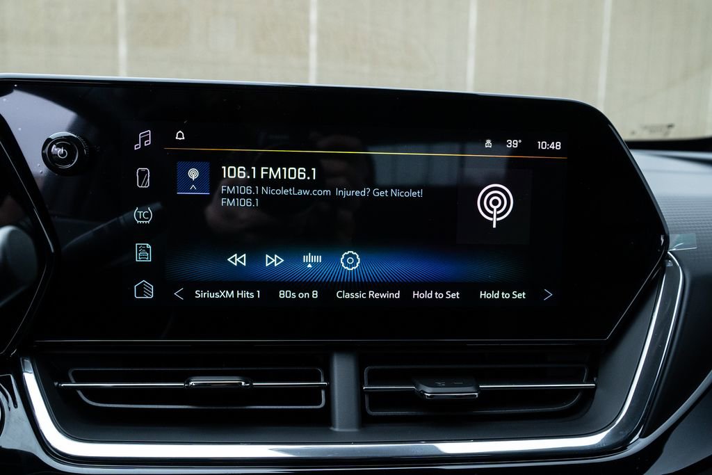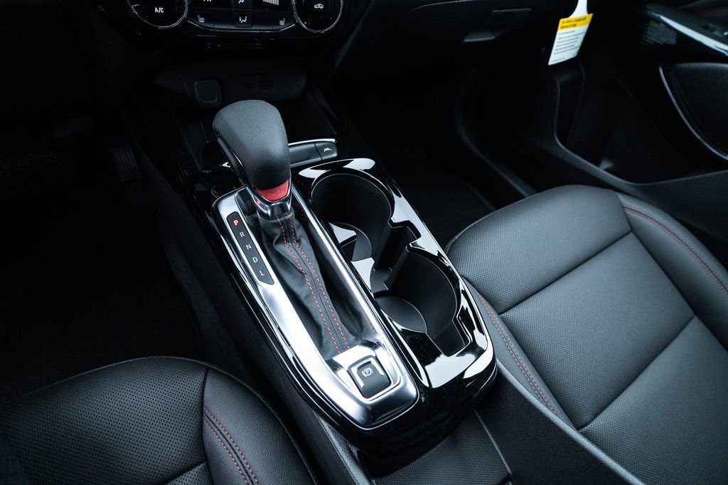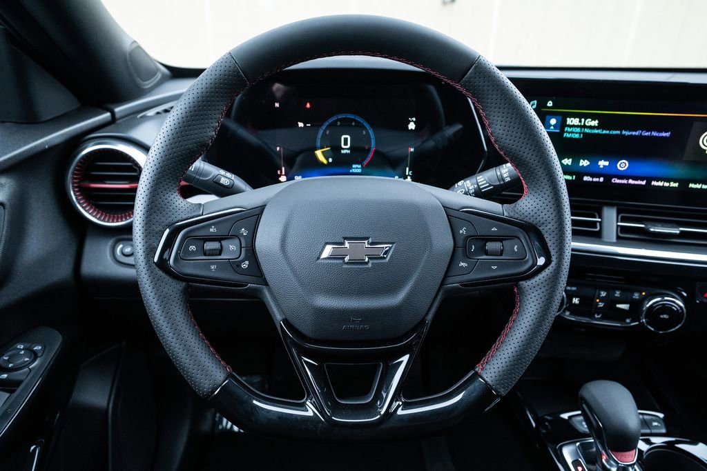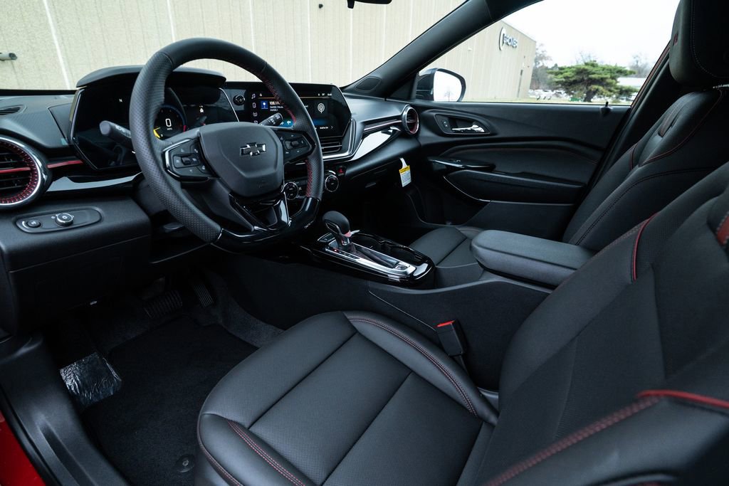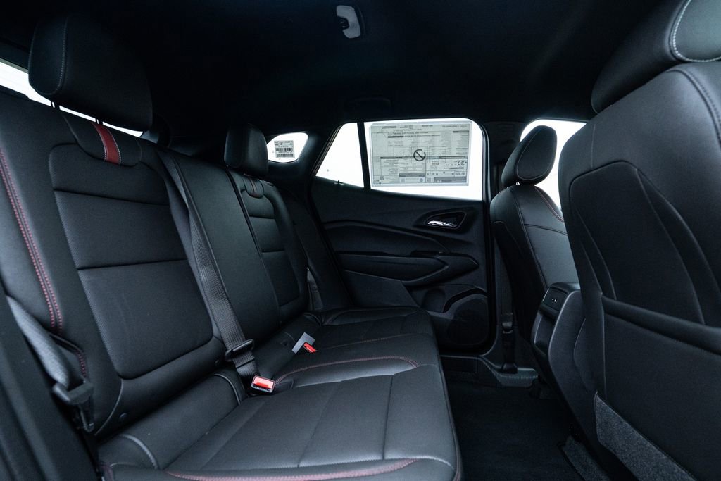 License Plate Front Mounting Package, Preferred Equipment Group 2RS, Trax 2RS, 2-Way Adjustable Front Head Restraints, 2-Way Power Driver Lumbar Seat Adjuster, 3.50 Final Drive Axle Ratio, 4-Way Manual Front Passenger Seat Adjuster, 4-Wheel Disc Brakes, 6 Speakers, 6-Speaker Audio System Feature, 8-Way Power Driver Seat Adjuster, ABS brakes, Air Conditioning, Alloy wheels, AM/FM radio: SiriusXM, Auto High-beam Headlights, Automatic temperature control, Brake assist, Bumpers: body-color, Compass, Delay-off headlights, Driver door bin, Driver vanity mirror, Dual front impact airbags, Dual front side impact airbags, Electronic Stability Control, Emergency communication system: OnStar One Essentials, Evotex Seat Trim, Exterior Parking Camera Rear, Front anti-roll bar, Front Bucket Seats, Front Center Armrest, Front reading lights, Front wheel independent suspension, Fully automatic headlights, Heated door mirrors, Heated Driver and Front Passenger Seats, Heated front seats, Heated steering wheel, Illuminated entry, Leather steering wheel, Low tire pressure warning, Occupant sensing airbag, Outside temperature display, Overhead airbag, Overhead console, Panic alarm, Passenger door bin, Passenger vanity mirror, Power door mirrors, Power driver seat, Power steering, Power windows, Premium audio system: Chevrolet Infotainment 3, Radio data system, Radio: AM/FM Stereo Audio System, Rear window defroster, Rear window wiper, Remote keyless entry, Security system, SiriusXM Trial Subscription, Speed control, Split folding rear seat, Spoiler, Sport steering wheel, Steering wheel mounted audio controls, Tachometer, Telescoping steering wheel, Tilt steering wheel, Traction control, Trip computer, Variably intermittent wipers, Wheels: 19 Black-Painted Machined Aluminum, and Wireless Apple CarPlay/Wireless Android Auto.