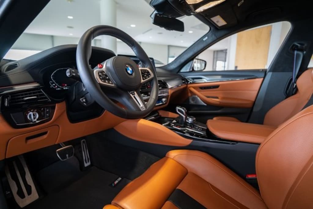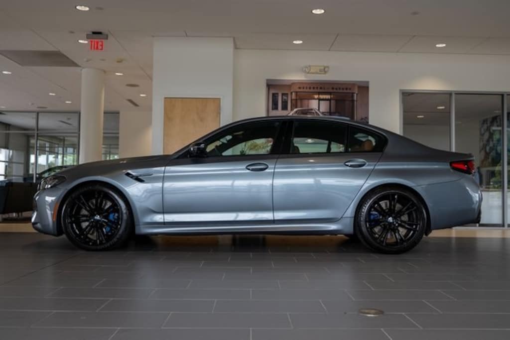 Competition Package (Extended Shadowline Trim, Individual Shadowline Lights, M Seat Belts, and Wheels: 20" x 9.5" Fr & 20" x 10.5" Rr M Y-Spoke), Competition Package (7MA), Connected Package Pro, Driving Assistance Plus Package (Active Driving Assistant Pro and Extended Traffic Jam Assistant), Executive Package (Active Park Distance Control, Drive Recorder, Front & Rear Heated Seats, Front Massaging Seats, Front Ventilated Seats, Parking Assistant Plus, Power Rear Sunshade & Rear Side Window Shades, Rear-View Camera, Soft-Close Automatic Doors, and Surround View w/3D View), M5 Competition, 4D Sedan, 4.4L V8 Turbocharged DOHC 32V LEV3-ULEV125 600hp, AWD, Bluestone Metallic, Aragon Brown Aragon Brown Full Merino Leath, ABS brakes, Alloy wheels, Electronic Stability Control, Front dual zone A/C, Heated door mirrors, Heated Front Seats, Heated front seats, Illuminated entry, Low tire pressure warning, Navigation System, Rear dual zone A/C, Remote keyless entry, Traction control, 16 Speakers, 4-Wheel Disc Brakes, Adaptive suspension, Air Conditioning, AM/FM radio: SiriusXM with 360L, Apple CarPlay & Android Auto Compatibility, Auto High-beam Headlights, Auto tilt-away steering wheel, Auto-dimming door mirrors, Auto-dimming Rear-View mirror, Automatic temperature control, BMW Assist eCall, BMW TeleServices, Brake assist, Bumpers: body-color, ConnectedDrive Services, Delay-off headlights, Driver door bin, Driver vanity mirror, Dual front impact airbags, Dual front side impact airbags, Emergency communication system: BMW Assist eCall, Enhanced USB &