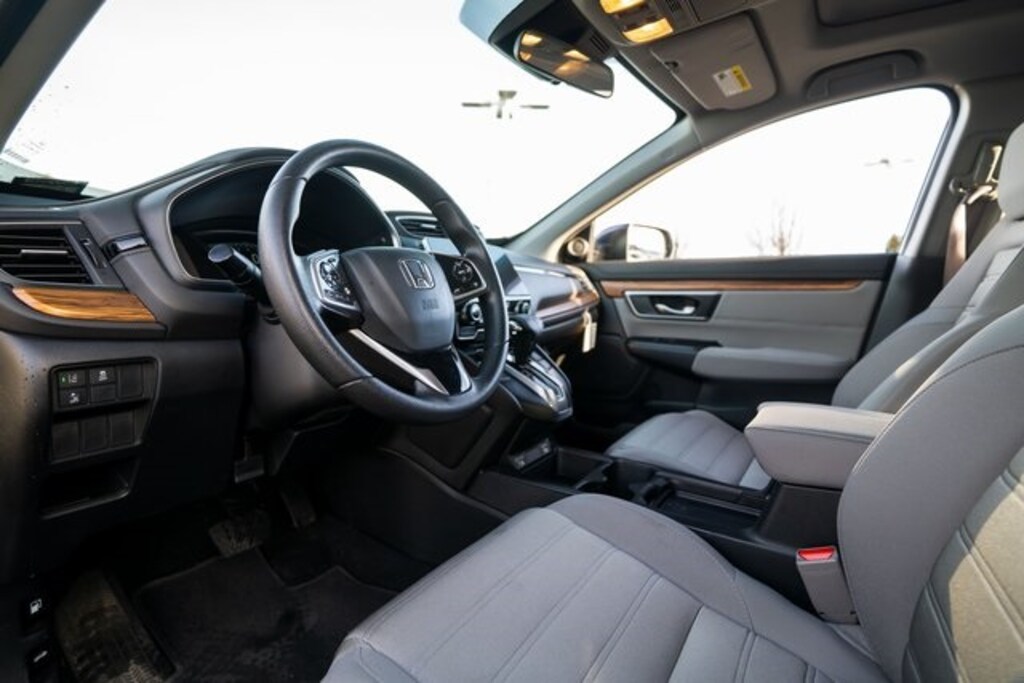 CR-V EX, 4D Sport Utility, AWD, Gray, 18" Alloy Wheels, 4-Wheel Disc Brakes, 5.64 Axle Ratio, 6 Speakers, ABS brakes, Adaptive Cruise Control: Adaptive Cruise Control (ACC) with Low-Speed Follow, Air Conditioning, Alloy wheels, AM/FM radio: SiriusXM, Apple CarPlay/Android Auto, Auto High-beam Headlights, Automatic temperature control, Blind Spot Information (BSI) System warning, Brake assist, Bumpers: body-color, Cloth Seat Trim, Compass, Delay-off headlights, Driver door bin, Driver vanity mirror, Dual front impact airbags, Dual front side impact airbags, Electronic Stability Control, Exterior Parking Camera Rear, Forward collision: Collision Mitigation Braking System (CMBS) + FCW mitigation, Four wheel independent suspension, Front anti-roll bar, Front Bucket Seats, Front Center Armrest, Front dual zone A/C, Front fog lights, Front reading lights, Heated door mirrors, Heated Front Bucket Seats, Heated front seats, Illuminated entry, Low tire pressure warning, Occupant sensing airbag, Outside temperature display, Overhead airbag, Overhead console, Panic alarm, Passenger door bin, Passenger vanity mirror, Power door mirrors, Power driver seat, Power moonroof, Power steering, Power windows, Radio data system, Radio: 180-Watt AM/FM/HD/SiriusXM Audio System, Rear anti-roll bar, Rear seat center armrest, Rear window defroster, Rear window wiper, Remote keyless entry, Security system, Speed control, Speed-sensing steering, Speed-Sensitive Wipers, Split folding rear seat, Spoiler, Steering wheel mounted audio controls, Tachometer, Telescoping steering wheel, Tilt steering wheel, Traction control, Trip computer, Turn signal indicator mirrors, and Variably intermittent wipers.