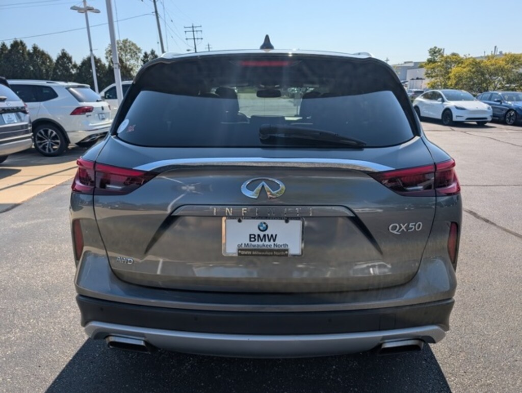 Cargo Package, Premium Heat Package (Heated Front Seats, Heated Steering Wheel, Memory Seats, Power Tilt & Telescopic Steering Wheel, and Reverse Synchronization Mirrors), ProACTIVE Package (Back-Up Collision Intervention (BCI), Blind Spot Intervention System (BSI), Direct Adaptive Steering, Distance Control Assist, Head-Up Display, High Beam Assist, Intelligent Cruise Control, Lane Departure Prevention (LDP), Lane Departure Warning System, Park w/Easy Steering, ProPILOT Assist, Rear Cross Traffic Alert, and Steering Assist), ProASSIST Package, QX50 ESSENTIAL, 4D Sport Utility, I4, AWD, Graphite Shadow, Graphite Leather, 4-Wheel Disc Brakes, 5.846 Axle Ratio, 6 Speakers, ABS brakes, Activation Disclaimer, Air Conditioning, Alloy wheels, AM/FM radio: SiriusXM, AM/FM/CD Audio System, Anti-whiplash front head restraints, Auto-dimming Rear-View mirror, Automatic temperature control, Brake assist, Bumpers: body-color, CD player, Delay-off headlights, Driver door bin, Driver vanity mirror, Dual front impact airbags, Dual front side impact airbags, Electronic Stability Control, Emergency communication system: INFINITI Connection, Exterior Parking Camera Rear, Floor Mats, Four wheel independent suspension, Front anti-roll bar, Front Bucket Seats, Front Center Armrest, Front dual zone A/C, Front fog lights, Front reading lights, Garage door transmitter: HomeLink, Heated door mirrors, Illuminated entry, Illuminated Kick Plates, Knee airbag, Leather Shift Knob, Literature Kit, Low tire pressure warning, Navigation system: INFINITI InTouch Navigation, Occupant sensing airbag, Outside temperature display, Overhead airbag, Overhead console, Panic alarm, Passenger door bin, Passenger vanity mirror, Power door mirrors, Power driver seat, Power Liftgate, Power moonroof, Power passenger seat, Power steering, Power windows, Radio data system, Rain sensing wipers, Rear air conditioning, Rear anti-roll bar, Rear reading lights, Rear seat center armrest, Rear window defroster, Rear window wiper, Remote keyless entry, Roof rack: rails only, Security system, Speed contr