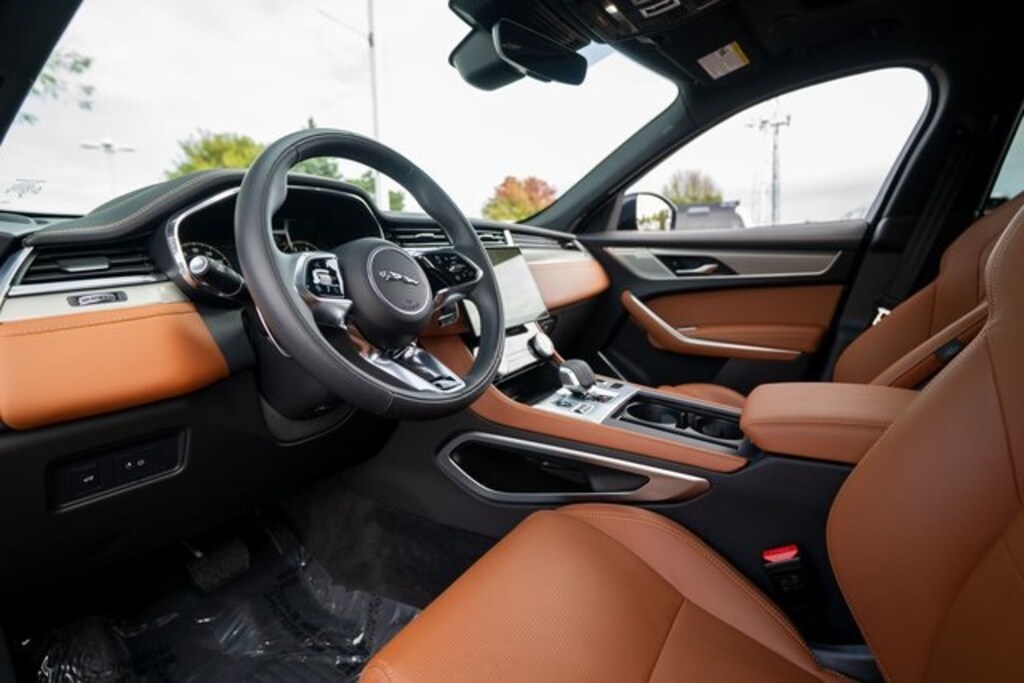 F-PACE P250, 4D Sport Utility, 2.0L I4 Turbocharged, AWD, White, Ebony/Ebony/Ebony Leather, 13 Speakers, 4-Wheel Disc Brakes, ABS brakes, Air Conditioning, Alloy wheels, AM/FM radio: SiriusXM, Apple CarPlay/Android Auto, Auto High-beam Headlights, Auto tilt-away steering wheel, Auto-dimming door mirrors, Auto-dimming Rear-View mirror, Automatic temperature control, Brake assist, Bumpers: body-color, Compass, Delay-off headlights, Driver door bin, Driver vanity mirror, Dual front impact airbags, Dual front side impact airbags, Electronic Stability Control, Emergency communication system: Remote SOS Emergency Call, Exterior Parking Camera Rear, Four wheel independent suspension, Front anti-roll bar, Front Bucket Seats, Front Center Armrest, Front dual zone A/C, Front fog lights, Front reading lights, Fully automatic headlights, Garage door transmitter: HomeLink, Heads-Up Display, Heated door mirrors, Heated front seats, Heated Front Sport Seats, Heated steering wheel, Illuminated entry, Leather Shift Knob, Leather steering wheel, Low tire pressure warning, Memory seat, Navigation system: Pivi Pro (Connected Navigation), Occupant sensing airbag, Outside temperature display, Overhead airbag, Overhead console, Panic alarm, Passenger door bin, Passenger vanity mirror, Perforated DuoLeather Seat Trim, Power door mirrors, Power driver seat, Power Liftgate, Power moonroof, Power passenger seat, Power steering, Power windows, Radio data system, Radio: Meridian 400W Sound System, Rain sensing wipers, Rear anti-roll bar, Rear fog lights, Rear reading lights, Rear seat center armrest, Rear window defroster, Rear window wiper, Remote keyless entry, Security system, Speed control, Speed-sensing steering, Split folding rear seat, Spoiler, Sport steering wheel, Steering wheel memory, Steering wheel mounted audio controls, Tachometer, Telescoping steering wheel, Tilt steering wheel, Traction control, Trip computer, Turn signal indicator mirrors, Variably intermittent wipers, and Wheels: 19" Diamond Turned (Style 5103)