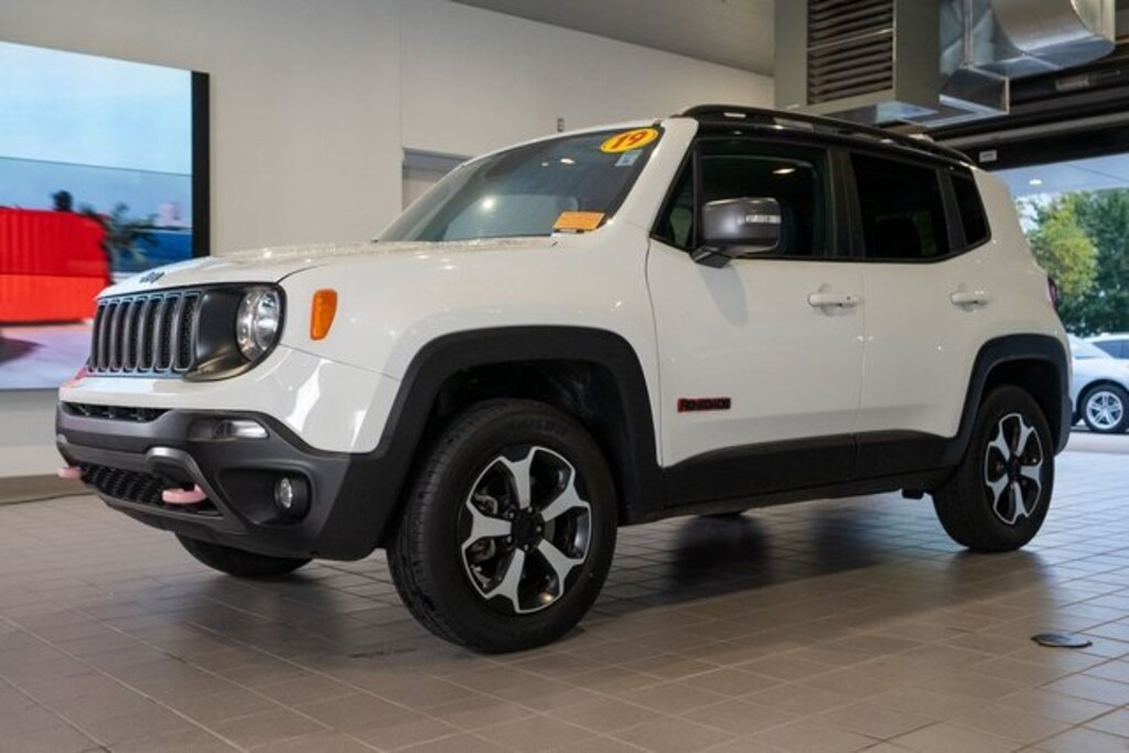 -New Tires, 10 YEAR 150,000 MILE LIMITED ENGINE WARRANTY, Discover rugged capability and refined comfort with this 2019 Jeep Renegade Trailhawk All-Wheel Drive, equipped with the Premium Package, available now at Mercedes-Benz of Milwaukee North. Dressed in a bold white exterior with a stylish black interior, this Trailhawk trim is built for both city driving and off-road adventures around Milwaukee, WI. The Premium Package adds upscale features like leather-trimmed seats, heated front seats and steering wheel, Uconnect infotainment system with touchscreen display, and advanced safety technologies. With its Trail Rated® performance, increased ground clearance, and Jeep’s legendary 4x4 capability, the 2019 Renegade Trailhawk is the perfect compact SUV for Wisconsin’s diverse terrain. Visit Mercedes-Benz Milwaukee North today to test drive this adventure-ready Renegade and elevate your driving experience., 1-Year SiriusXM Guardian Trial, 177HP Power Rating, 4 Pin Wiring Harness, 40/20/40 Rear Seat w/Trunk Pass-Thru, 5-Year SiriusXM Traffic Service, 5-Year SiriusXM Travel Link Service, 8.4" Touchscreen Display, Auto-Dimming Rear-View Mirror, Beats Premium Audio System, Class III Receiver Hitch, Front Seat Back Map Pockets, GPS Navigation, HD Radio, Heated Front Seats, Heated Steering Wheel, Keyless Entry w/Panic Alarm, Manual Adjust 4-Way Front Passenger Seat, Passive Entry Remote Start Package, Power 4-Way Driver Lumbar Adjust, Power Adjust 8-Way Driver Seat, Premium Leather Group For Trailhawk, Premium Leather Trimmed Bucket Seats, Quick Order Package 22C, Radio: Uconnect 4C Nav w/8.4" Display, SiriusXM Traffic Plus, SiriusXM Travel Link, Trailer Tow Group, Uconnect 8.4 Nav Group, Windshield Wiper De-Icer. Odometer is 2877 miles below market average!