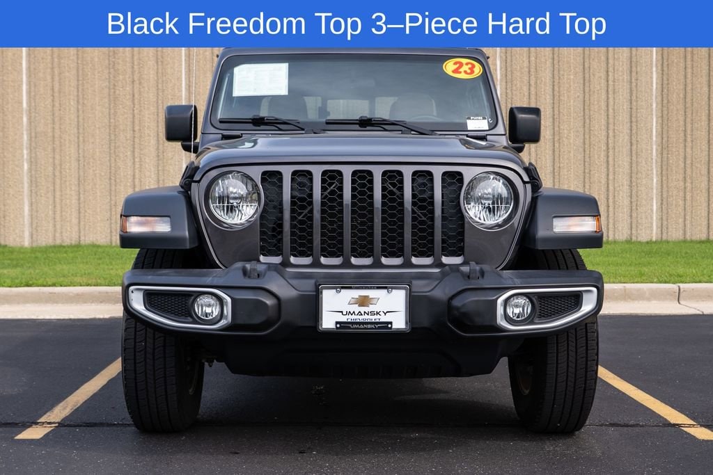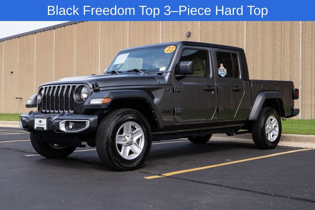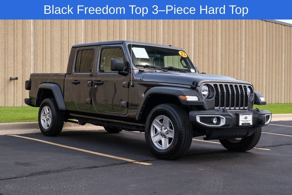 CARFAX One Owner, includes 10 Year / 150,000 Mile Warrranty, Discover adventure-ready capability with this rugged 2023 Jeep Gladiator Sport featuring a bold Sting-Gray Clearcoat exterior and a refined black interior, now available at Umansky Chevrolet in Milwaukee. This versatile midsize pickup combines legendary Jeep 4x4 performance with the utility of a truck, perfect for both off-road trails and city streets. Equipped with a durable bed, removable top and doors, and advanced tech features, the Gladiator Sport is designed for drivers who demand power, freedom, and functionality. Donât miss your chance to own a head-turning 2023 Jeep Gladiator visit Umansky Chevrolet Milwaukee today and take command of your next adventure!, Black Freedom Top® 3 Piece Hard Top, Automatic Headlamps, Black 3-Piece Hard Top, Deep Tint Sunscreen Windows, Freedom Panel Storage Bag, Front 1-Touch Down Power Windows, Normal Duty Plus Suspension, Power Heated Mirrors, Power Tailgate Lock, Premium Wrapped Steering Wheel, Quick Order Package 24S Sport S, Rear Sliding Window, Rear Window Defroster, Remote Keyless Entry, Security Alarm, Speed Sensitive Power Locks, Sport S, Sun Visors w/Illuminated Vanity Mirrors, Wheels: 17 x 7.5 Tech Silver Aluminum. Odometer is 1778 miles below market average! Priced below KBB Fair Purchase Price!
