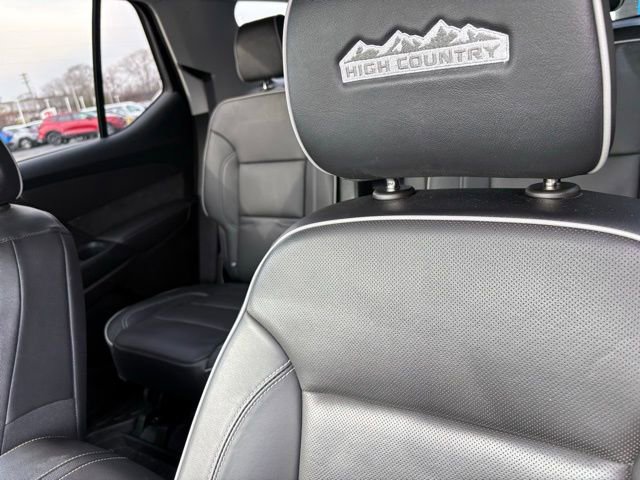 Floor Liner Package (LPO) (1st & 2nd Row All-Weather Floor Liner (LPO), 3rd Row All-Weather Floor Liner (LPO), and Integrated Cargo Liner (LPO)), Front License Plate Bracket Mounting Package, Preferred Equipment Group 2LZ, Traverse High Country, AWD, 10 Speakers, 20 Polished Aluminum Wheels, 3.49 Axle Ratio, 3rd row seats: split-bench, 4-Wheel Disc Brakes, 7-Passenger Seating (2-2-3 Seating Configuration), ABS brakes, Air Conditioning, Alloy wheels, AM/FM radio: SiriusXM with 360L, Apple CarPlay/Android Auto, Auto High-beam Headlights, Auto-dimming door mirrors, Auto-dimming Rear-View mirror, Automatic temperature control, Bose Premium 10-Speaker Audio System Feature, Brake assist, Bumpers: body-color, Compass, Delay-off headlights, Driver door bin, Driver vanity mirror, Dual front impact airbags, Dual front side impact airbags, Electronic Stability Control, Emergency communication system: OnStar and Chevrolet connected services capable, Four wheel independent suspension, Front anti-roll bar, Front Bucket Seats, Front Center Armrest, Front dual zone A/C, Front fog lights, Front reading lights, Fully automatic headlights, Garage door transmitter, Heated door mirrors, Heated front seats, Heated rear seats, Heated steering wheel, Illuminated entry, Leather steering wheel, Low tire pressure warning, Memory seat, Navigation System, Occupant sensing airbag, Outside temperature display, Overhead airbag, Overhead console, Panic alarm, Passenger door bin, Passenger vanity mirror, Perforated Leather-Appointed Seat Trim, Power door mirrors, Power driver seat, Power Liftgate, Power moonroof: Dual SkyScape, Power passenger seat, Power steering, Power windows, Premium audio system: Chevrolet MyLink, Radio data system, Radio: Chevrolet Infotainment 3 Premium System, Rear air conditioning, Rear anti-roll bar, Rear reading lights, Rear window defroster, Rear window wiper, Remote keyless entry, Roof rack: rails only, Security system, SiriusXM w/360L, Speed control, Speed-sensing steering, Spoiler, Steering wheel memory, Steering wheel mounted audio controls, Tachometer, Telescoping steering wheel, Tilt steering wheel, Traction control, Trip computer, Turn signal indicator mirrors, Variably intermittent wipers, Ventilated front seats, and Voltmeter.